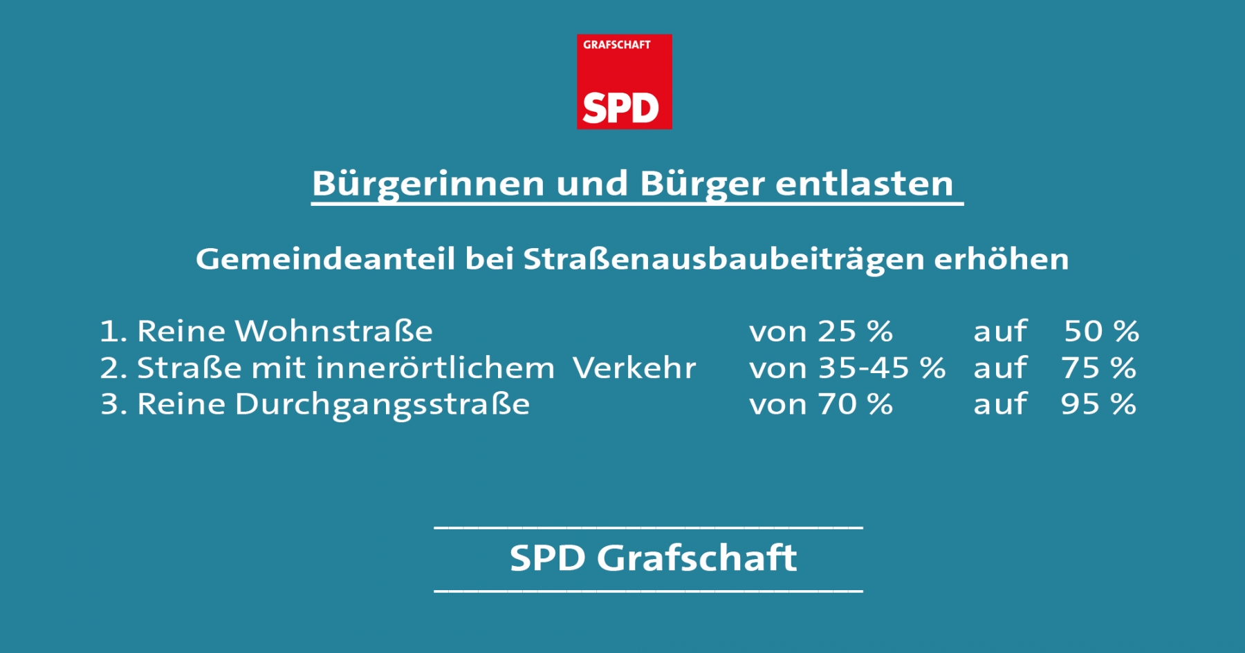 Die Vielfalt der Meinungen und Sichtweisen muss sich in unterscheidbaren Parteiprogrammen  widerspiegeln.  Die SPD Grafschaft möchte ein Zukunftskonzept für die Grafschaft entwickeln, das sich am Gemeinwohl orientiert, sozial und gerecht ist und die Bedürfnisse der Bürgerinnen und Bürger in den Focus stellt.  Das wird  ihr politisches Angebot sein, das sie zur Kommunalwahl 2019  unterbreiten wird.