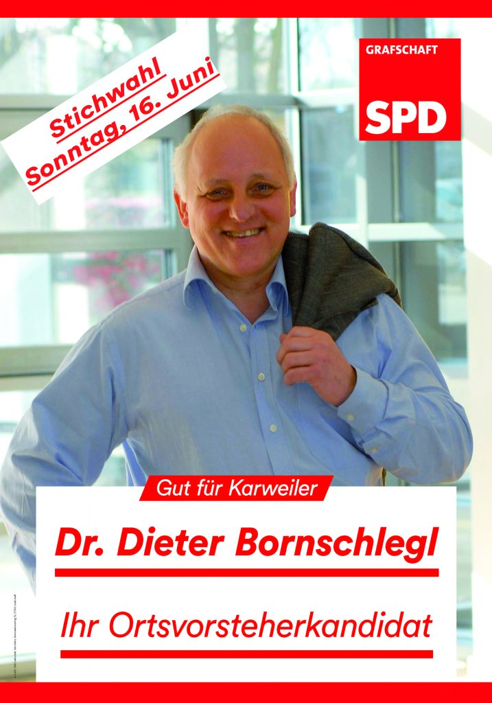 Weiter setzt sich die SPD wie in den vergangenen Jahren gegen ein eventuelles Güllelager, eine Schadstoffdeponie in Leimersdorf und für mehr naturnahe Bepflanzung ein. Dr. Dieter Bornschlegl. Ortsvorsteherkandidat für Karweiler: „Ob bei der Deponie oder beim Gülleverbot für gemeindeeigenen Flächen – wir Sozialdemokraten waren immer die ersten, die sich für den Umweltschutz aktiv eingesetzt haben.“
